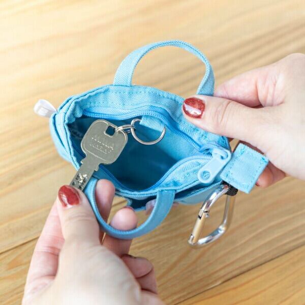 ミニサイズがかわいいトートバッグ型のキーケースです。内側にDカンが付いているので鍵を付けられます。前面に2ヶ所・背面に1か所ポケット付きでリップクリームやヘアピンなど小物を収納するのにぴったり。カラビナ付きでバッグにぶら下げたり、ぬいぐるみに持たせてもかわいいですよ♪