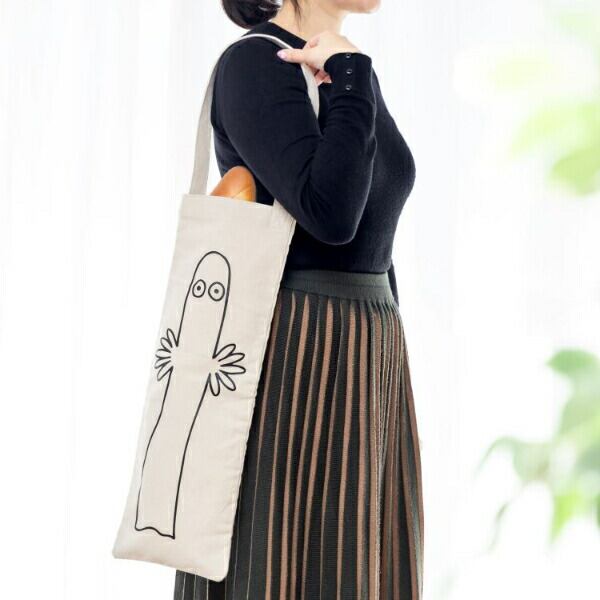 なが〜いトートバッグ。フランスパンが入るくらいの細長いバッグには、ニョロニョロのイラストが大きくプリントされておりインパクト大!フランスパンや、野菜、ワインボトルなどなど…細長い物を入れて持ち運べます。